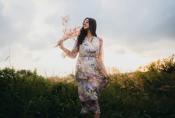 The print blooms like ink washed across silk — soft, organic, alive. A lightweight woven base creates fluid drape with structured restraint. A gathered waist shapes the form with gentle definition. Every turn leaves behind the trace of movement itself.