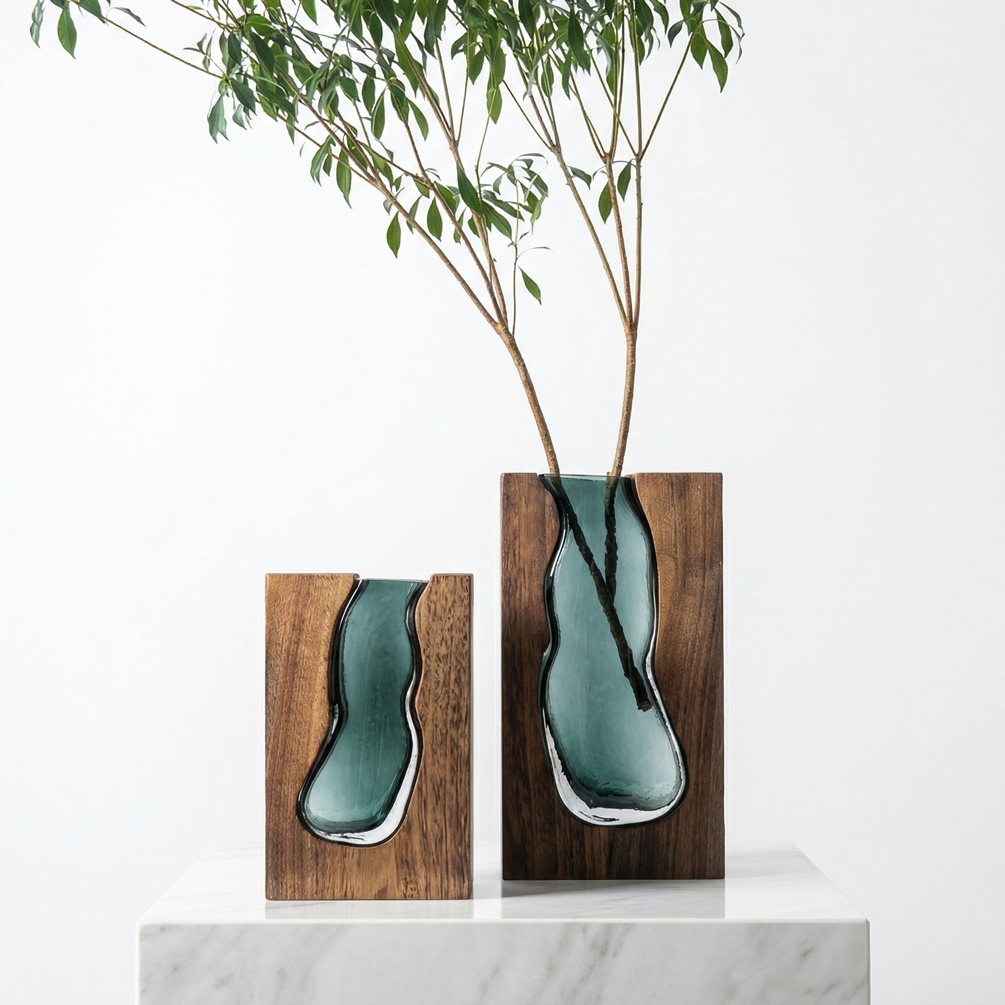 This Nordic-style wooden glass vase is a perfect blend of natural solid wood and handcrafted flowing glass. The thick wooden frame is carefully crafted from solid wood, combined with a hand-blown teardrop-shaped glass insert, creating the visual effect of frozen flowing water inside the wood.